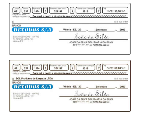 O cheque é uma ordem de pagamento à vista. Pode ser recebido diretamente na agência em que o emitente mantém conta ou depositado em outra agência, para ser compensado e creditado na conta do correntista. Ao emití-lo, lembre-se que ele poderá ser descontado imediatamente.