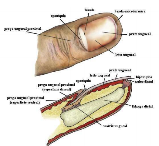 A unha é uma estrutura epitelial queratinizada que apresenta um crescimento contínuo durante toda a vida. É composta pelo prato ungueal, matriz ungueal, leito ungueal, pregas ungueais proximal e laterais e hiponíquio. O prato ungueal, de forma aproximadamente retangular, encontra-se na porção distal da face dorsal dos dedos. Resulta principalmente da maturação e queratinização do epitélio da matriz ungueal. Esta é responsável pela formação das porções dorsal e intermédia do prato ungueal, enquanto o leito ungueal contribui para a porção ventral.