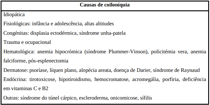 Alguns autores defendem ainda, como causas de coiloníquia, uma dieta deficiente em proteínas, riboflavina, niacina ou vitamina C, acromegalia, policitemia e hipertiroidismo, em que o aumento da taxa metabólica promove a exaustão gradual de aminoácidos estruturais. Já no caso de psoríase da unha, pode haver coiloníquia devido à pressão ascendente exercida pela hiperqueratose do leito ungueal. Sendo assim, quando a queratose subungueal acompanha a coiloníquia, deve-se pensar em psoríase. Observam-se situações ocupacionais que também são responsáveis por esses dois sinais, tais como trabalhos que impliquem o manuseamento de cimento ou óleo (mecânicos).