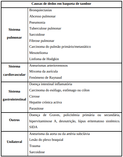 Este sinal, dedos em baqueta de tambor, inicialmente descrito por Hippocrates, é também conhecido por “dedos hipocráticos” e “unhas em vidro de relógio”. Caracteriza-se por um aumento da curvatura, transversa e longitudinal, do prato ungueal, hipertrofia dos tecidos moles da polpa digital e hiperplasia do tecido fibrovascular na base da unha.