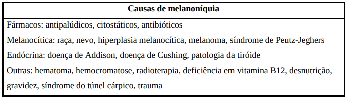 Pode ser um achado normal em pessoas com pele mais pigmentada, tais como os hispânicos, asiáticos e negros, ocorrendo em mais de 77% dos indivíduos de raça negra com mais de 20 anos. Porém, já foi associada a acantose nigricans, doença de Addison, síndrome de Peutz-Jeghers e SIDA. Num estudo efetuado em França, foi encontrada melanoníquia longitudinal em 14,8% dos doentes infectados com o VIH (vírus da imunodeficiência humana). A melanoníquia foi também descrita em doentes com desnutrição, deficiência em vitamina D e vitamina B12 e hemocromatos.