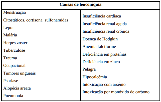 A leuconiquia total é uma situação rara, mais associada a colite ulcerosa, febre tifoide, cirrose e lepra. Já no caso de ser parcial, há um arco rosado com 2 a 4 mm de largura, distal à área branca. Esta tem sido relacionada com tuberculose, nefrite, doença de Hodgkin, carcinoma metastático e lepra.