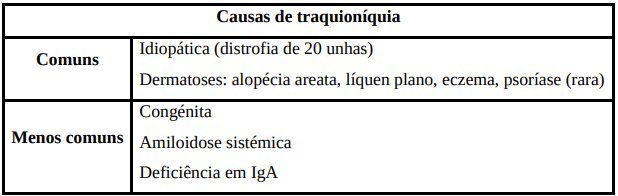 A superfície das unhas pode apresentar estrias longitudinais. Nos idosos é uma situação normal, habitualmente devido a baixa ingestão hídrica e de alimentos. Contudo, se, além disso, a unha for fina, frágil, áspera e com uma opacidade acinzentada e sem brilho já estamos perante traquioníquia.