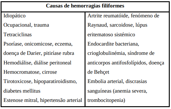 As hemorragias filiformes correspondem a extravasamentos de sangue ao longo dos vasos do leito ungueal. Têm um padrão linear devido à orientação longitudinal dos capilares. Clinicamente, são visíveis riscas lineares, normalmente no terço distal do prato ungueal, inicialmente de cor arroxeada que, um a dois dias depois, passam a ter uma cor mais acastanhada. Surgem com mais frequência no polegar, indicador e médio. Acompanham o crescimento da unha e não desaparecem com a digitopressão. São mais frequentes em indivíduos do sexo masculino e de raça negra.