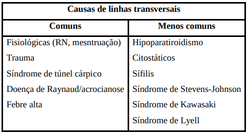 Há dois tipos de alterações transversais, as que se localizam no prato ungueal e as que estão no leito ungueal. As lesões do prato ungueal não se alteram se se aplicar pressão, ao contrário das lesões do leito ungueal. Em caso de condições sistêmicas ou endógenas, as lesões acompanham a forma e o contorno da lúnula. Por outro lado, nas condições exógenas, as lesões acompanham a forma e o contorno da prega ungueal proximal. Depressões transversas que se estendem de um lado ao outro da unha chamam-se linhas de Beau. Em 1846, Beau descreveu sulcos transversos no prato ungueal, bilaterais, como manifestação de febre tifoide e outras doenças sistêmicas agudas.