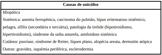 A extensão da onicólise vai aumentando progressivamente e pode ser estimada medindo a distância que vai desde o limite distal da lúnula até ao limite proximal do descolamento. A onicólise é mais frequente no sexo feminino, provavelmente secundária a trauma, relacionado, na maior parte das vezes, com trabalhos domésticos ou manicure. No entanto, tem sido observada em associação a muitas doenças sistêmicas, como é o caso de hipertiroidismo (também conhecida por “unha de Plummer”), hipotiroidismo, porfiria, sífilis e pelagra. Porém, é um sinal inespecífico.
