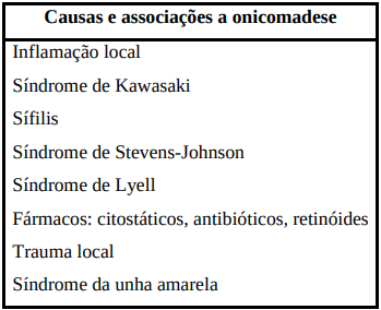 A onicomadese pode ser devida a doenças sistêmicas, stress psicológico, citostáticos e paroníquia aguda. É comum o seu aparecimento na sequência de alterações neuro-vasculares, como episódios repetidos de hipocalcemia ou hipocalcemia crônica com espasmo arteriolar. Consequentemente há separação abrupta do prato ungueal, manifestando-se clinicamente como onicomadese. Outras situações associadas são a intoxicação por arsênio e por chumbo. A perda total da unha pode ocorrer devido a dano permanente da matriz consequente a traumatismos, ou estádios tardios de líquen plano, ou quando há uma deficiente circulação periféric.