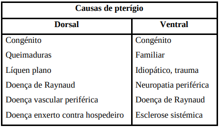 O pterígio ungueal inverso, também conhecido como pterígio ventral, ocorre quando a pele próxima do hiponíquio adere ao prato ungueal, eliminando o sulco distal e progredindo em sentido proximal. Pode afetar toda a unha ou só uma parte, e uma ou várias unhas. A pele na porção distal atrofia, por oclusão do fluxo vascular. Este sinal está normalmente associado a doenças dos tecidos conjuntivos, em particular a esclerose sistêmica progressiva, associada ao fenômeno de Raynaud, e o lúpus eritematoso sistêmico. Na maior parte dos casos é assintomático, mas pode ser acompanhado de dor
