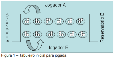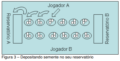1) São distribuídas três sementes em cada concavidade. Os reservatórios laterais não receberão sementes para o início da partida;