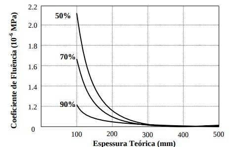 METHA & MONTEIRO [1994] classificam por espessura teórica ou efetiva os parâmetros de tamanho e forma da peça usados para expressar uma única quantidade, que é igual a área da seção dividida pelo semiperímetro em contato com a atmosfera. Essa relação entre espessura teórica e coeficiente de fluência é mostrada na Figura 3.3