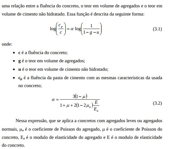 Segundo NEVILLE [1997], deve ser notado que realmente é a pasta de cimento hidratado que apresenta fluência, sendo o papel do agregado basicamente o de contenção; os agregados não são sujeitos à fluência quando submetidos às tensões usuais no concreto. Assim, o autor afirma que a fluência é uma função do teor, em volume, da pasta de cimento no concreto, mas a dependência não é linear . Existe uma relação entre a fluência do concreto, o teor em volume de agregados e o teor em volume de cimento não hidratado. Essa função é descrita da seguinte forma: