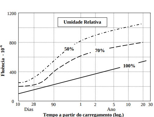 NEVILLE [1997] afirma que um dos fatores mais importantes que atuam sobre a fluência é a umidade relativa do ar que envolve o concreto, isso quer dizer que para se obter uma menor fluência, o concreto deve, teoricamente, ser exposto em ambientes com altos níveis de umidade. Isso é ilustrado na Figura 3.2 para peças curadas a umidade relativa de 100% e depois carregadas e expostas a diversas umidades.