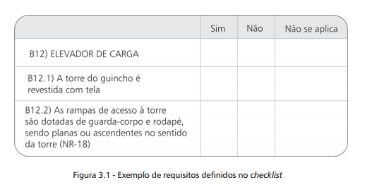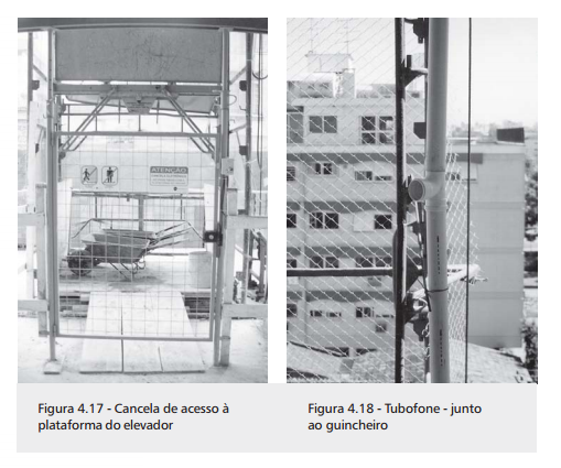 Os requisitos foram definidos da forma mais objetiva possível, tentando-se, assim, possibilitar a verificação visual da sua existência ou não, dispensando medições, consultas a outras pessoas ou a projetos da obra. Exemplificando o que foi exposto, são mostrados na Figura 3.1 dois dos requisitos de qualidade que a lista estabelece para o elemento elevador de carga. A lista completa encontra-se no anexo A.