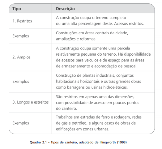 De acordo com Illingworth (1993), os canteiros de obra podem ser enquadrados dentro de um dos três seguintes tipos: restritos, amplos e longos e estreitos. No Quadro 2.1 é caracterizado cada um destes tipos.