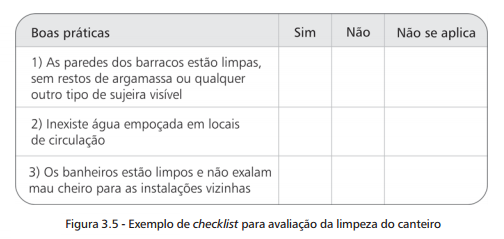 A lista de verificação é a mais abrangente dentre as ferramentas, permitindo uma ampla análise qualitativa do canteiro, no âmbito da logística e do layout, segundo os seus três principais aspectos: instalações provisórias, segurança no trabalho e sistema de movimentação e armazenamento de materiais