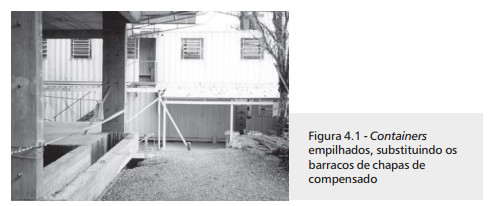 A utilização de containers na construção é uma prática habitual em países desenvolvidos e uma alternativa adotada há algum tempo, por exemplo, em obras de montagem industrial e grandes empreendimentos. Embora atualmente venha ocorrendo uma disseminação do uso de containers em obras de edificações residenciais e comerciais, essa opção ainda pode ser considerada minoritária se comparada aos barracos em madeira.