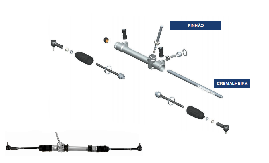 O pinhão e a cremalheira são os componentes responsáveis por transformar o giro do volante no movimento angular das rodas do veículo.