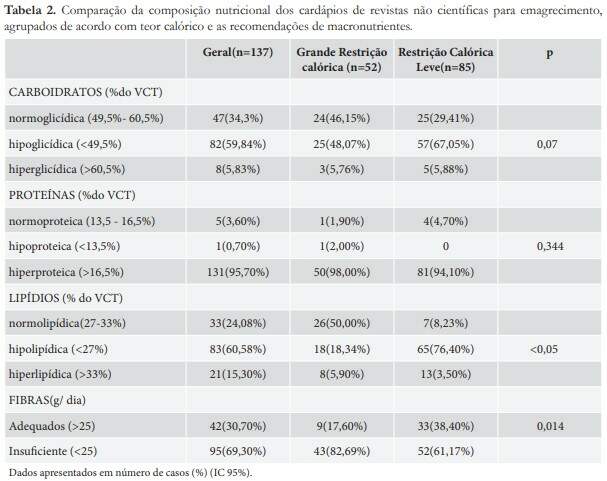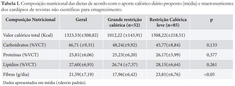 O objetivo deste estudo foi comparar a composição nutricional de dietas para emagrecimento publicadas em revistas não científicas com as recomendações dietéticas atuais de macronutrientes propostas pela ADA7 , preconizadas para mulheres adultas e jovens.