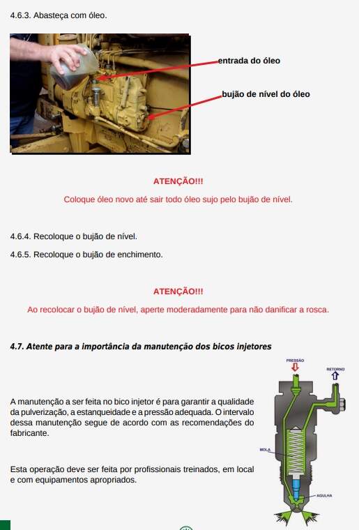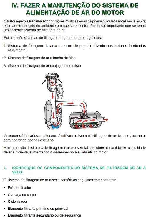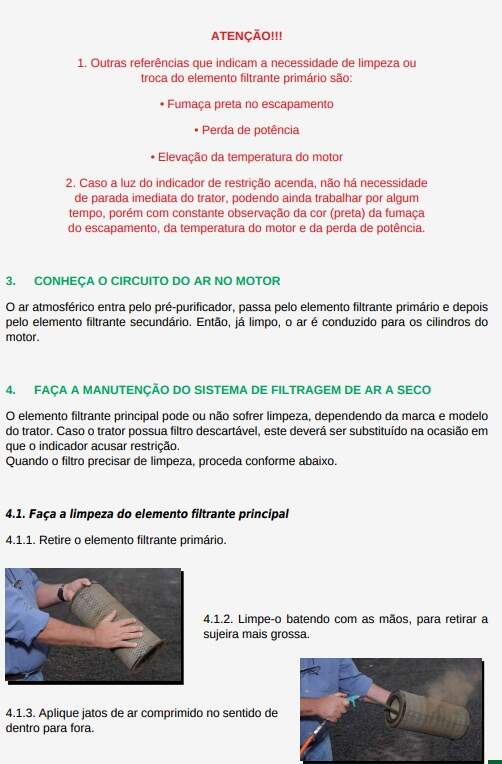 A manutenção é o conjunto de operações realizadas, visando à conservação do trator de forma a mantê-lo em condições de uso. Quando realizada no período certo e de forma correta, a manutenção garante um melhor aproveitamento da máquina e maximiza sua vida útil, resultando em operações com qualidade e menor custo operacional. O período de manutenção preventiva de tratores agrícolas pode variar de marca para marca, portanto, “o manual do operador” deve estar sempre à mão. Não foi considerado aqui quando se fazer a manutenção, e sim como se fazer.