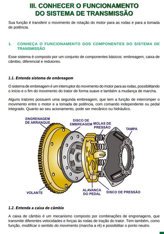 O trator agrícola é formado por vários componentes, com funções específicas de transformação e transferência de energia para sua locomoção e movimentação das máquinas e implementos nele acoplados.