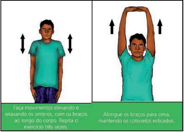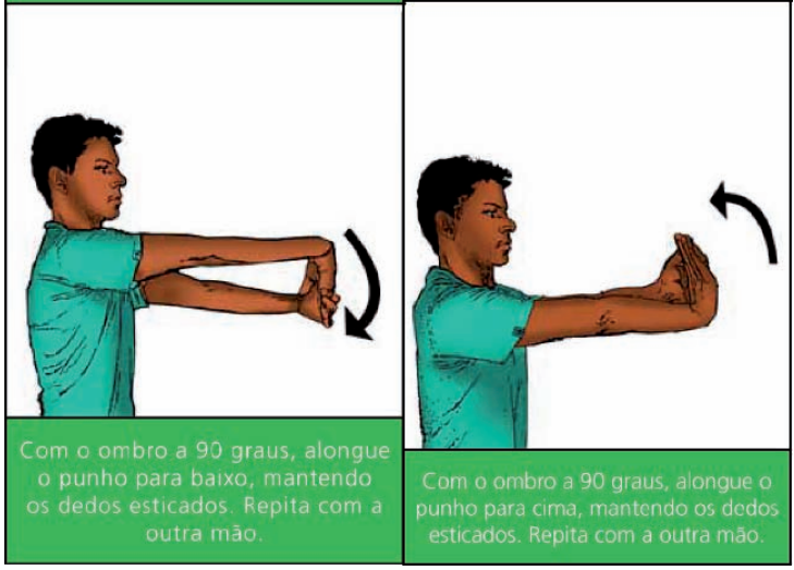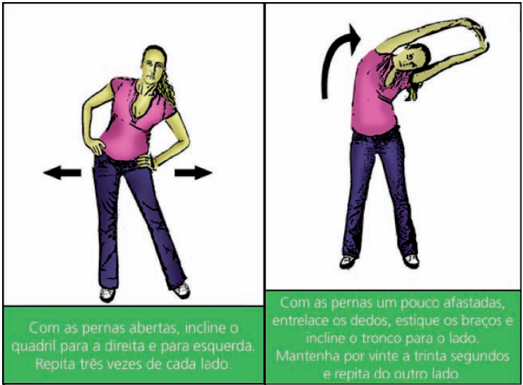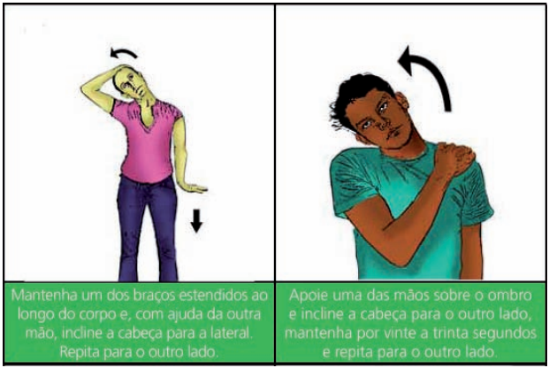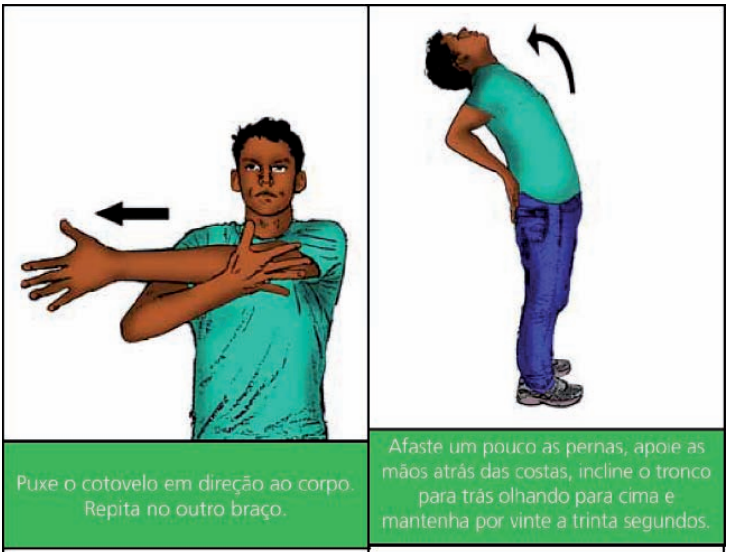 - Faça sempre os exercícios de alongamento antes, durante e depois das atividades.