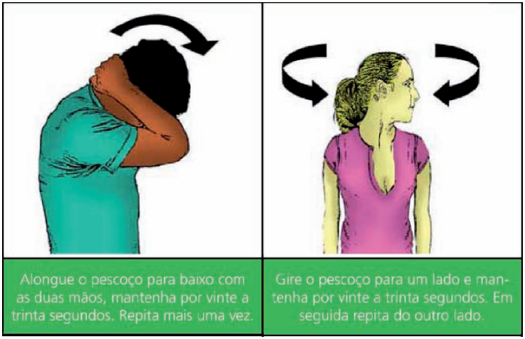 - Siga as indicações na ilustração, escolhendo dois exercícios para cada parte do corpo, ombro, pescoço, braços, mãos, coluna, pernas e pés.