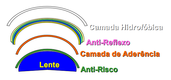 Sequência de camadas que uma lente recebe. O anti-risco é a primeira camada a ser aplicada. Na sequência, a de aderência, responsável por fixar o anti-reflexo na superfície da lente. O anti-reflexo vem em seguida e, por último, a camada hidrofóbica, própria para repelir a água, o que resulta em conforto para o usuário e facilidade ao limpar as lentes.