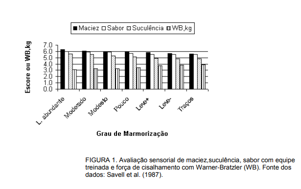 No mesmo experimento, os autores reallizaram testes com procedimentos padronizados e equipe de oito provadores treinados, que degustaram e atribuíram notas numa escala de 1 (extremamente suculenta, macia ou saborosa) a 8 (extremamente seca, dura ou sem gosto) a pedaços de 1 x 1 x 2,5cm. Mediram também a força de cisalhamento em célula de Warner-Bratzler (WB), e concluíram que as avaliações feitas pela equipe treinada concordavam com as dos consumidores, isto é, na medida em que diminuía o grau de marmorização de "levemente abundante" a "traços", os escores de maciez, suculência e intensidade de sabor também diminuíam e a força WB aumentava (Figura 1).