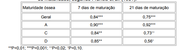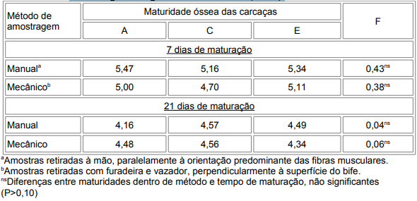 Tabela 1. Médias de força de cisalhamento WB (kg), por tempo de maturação, maturidade óssea das carcaças e método de amostragem, segundo Francis et al.(1981).