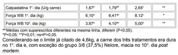 Tabela 3. Atividade de calpastatina no 1o . dia post mortem e maciez do contrafilé de novilhos de três diferentes genótipos, segundo Rubensam et al. (1998).
