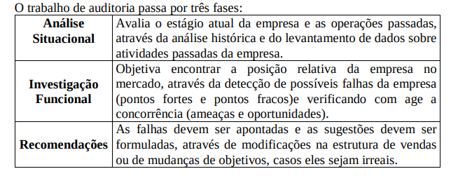 Consiste em um exame periódico, abrangente, sistemático e independente do departamento de vendas da empresa, visando à determinação das áreas de problemas e à recomendação de um plano de ação corretivo para melhorar a eficácia de vendas da empresa.