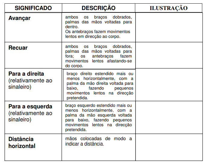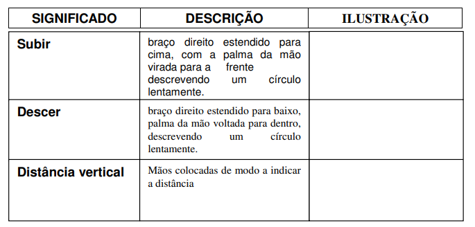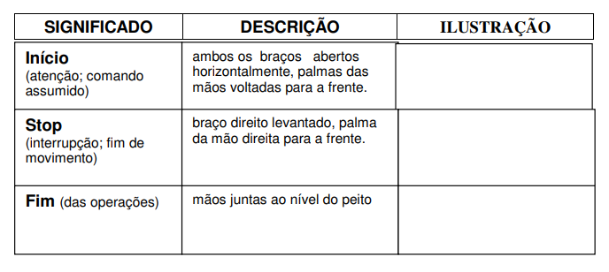 - Sinais gestuais para que, quando a comunicação de viva voz não seja possível, se possam dar as indicações necessárias.