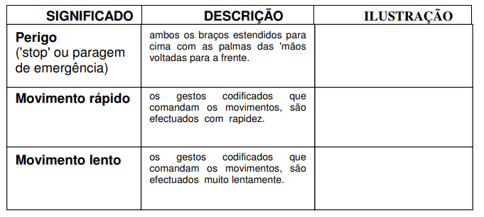 Os gestos devem ser simples, fáceis de executar e de compreender. Nos quadros seguintes, exemplificam-se alguns gestos codificados.