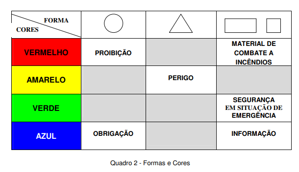 A forma geométrica e o significado dos sinais de segurança, bem como a combinação das formas e das cores e seu significado nos sinais estão indicados nos quadros 1 e 2.