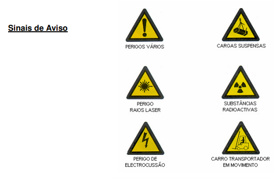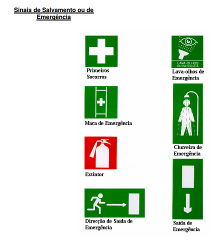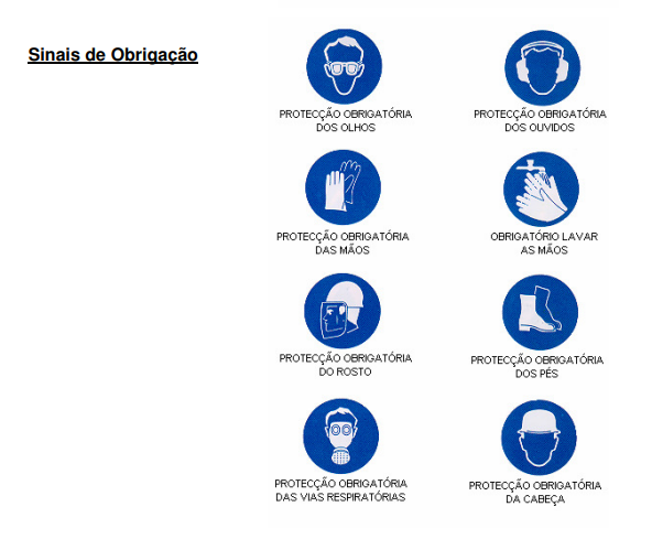 De acordo com a legislação vigente, apresentam-se seguidamente os sinais relativos à sinalização de segurança e saúde. De qualquer forma, existem disponíveis no mercado alguns outros sinais que poderão complementar as prescrições mínimas previstas na lei.