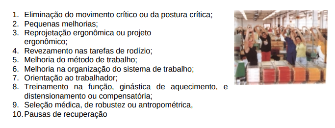 A solução ergonômica para a prevenção da LER não é necessariamente dispendiosa, desde que se tenha uma noção das dez alternativas de ação para resolução dos problemas, quais sejam: