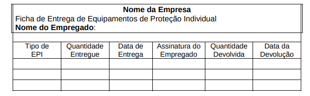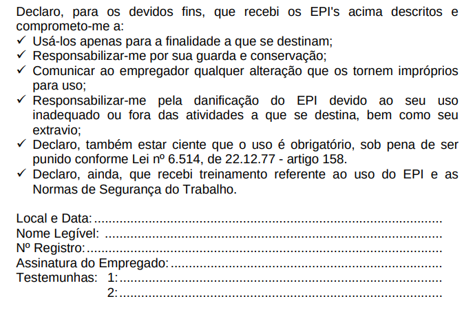 O empregador só deve fornecer os EPI's mediante recibo firmado pelo trabalhador (modelo abaixo), constituindo-se em prova a ser produzida em juízo, todos os equipamentos têm de estarem relacionados, mesmo aqueles cujo o fornecimento seja diário.