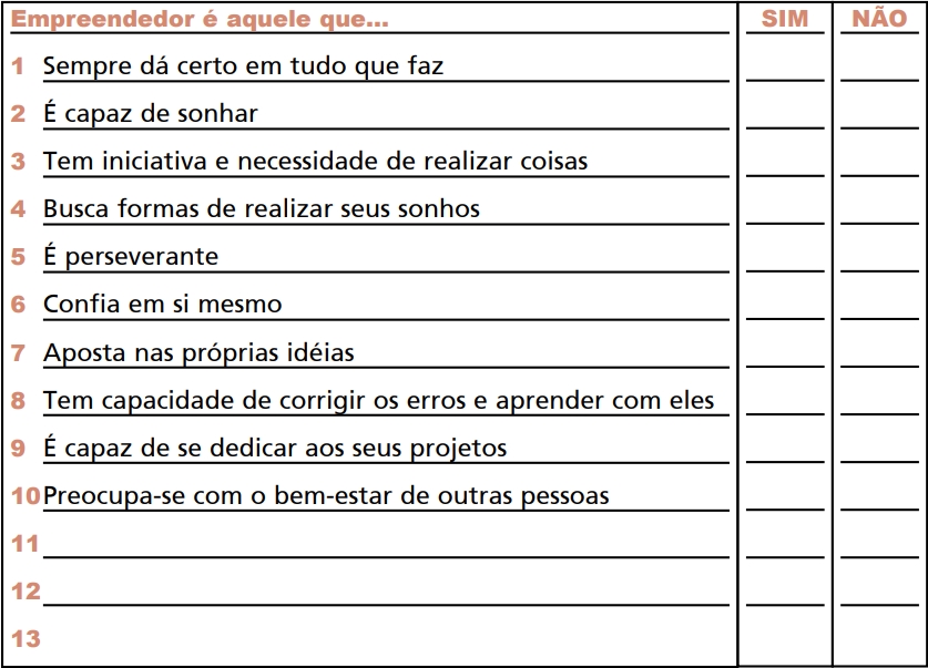 Educador, todos os exercícios têm o objetivo de mexer com várias alternativas e áreas onde se localizam os sonhos. À medida que realizações ou produtos passam à esfera do atendimento ao interesse de outros, é possível que os jovens detectem a importância de projetarem seu futuro inserido em determinados contextos e relacionado com diferentes coletividades, pois, conforme já se disse em outros momentos, o empreendedor é um cidadão que não deseja atender apenas aspectos individuais, mas principalmente provocar mudanças no ambiente em que vive