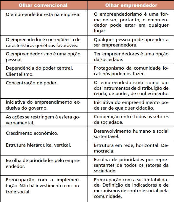 O mesmo ocorre em sociedades que costumam projetar o seu futuro e planejar formas de realizá-lo, pois não ficam esperando que alguém de fora venha resolver seus problemas, ao contrário, identificam que setores devem ser acionados e exigem o cumprimento de suas obrigações, criando as condições necessárias para realizarem seus objetivos. Comente também a afirmativa de que o olhar convencional preocupa-se com o crescimento econômico, enquanto o olhar empreendedor considera o desenvolvimento humano e social sustentável. Há diferença entre crescimento econômico e desenvolvimento humano e social sustentável, porque o primeiro (crescimento econômico) não garante distribuição de renda. Experiências recentes no Brasil demonstram que, apesar do aumento do PIB e da renda per capita, a renda ficou ainda mais concentrada e houve aprofundamento da desigualdade social. Numa concepção moderna do que seja desenvolvimento, só é possível falar nele se for humano e socialmente sustentável, e quando melhorar as condições de vida da população e elas tiverem acesso ao conhecimento, à riqueza e ao poder.