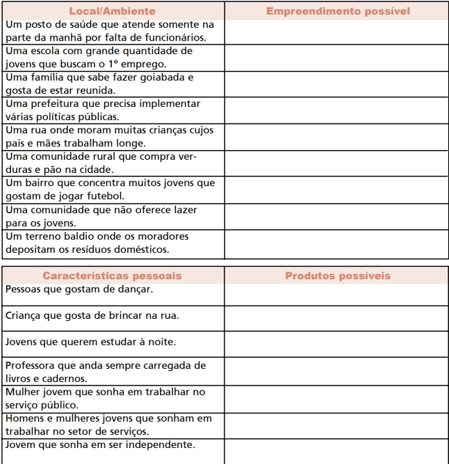 Soluções empreendedoras: Desde o início da unidade, estamos construindo coletivamente as características empreendedoras, identificando práticas que buscam realizar sonhos, gerando idéias que precisam vir acompanhadas de ações que as viabilizem, entre outras questões que envolvem a visão projetada no futuro. Mas nem sempre é fácil transformar idéias em bens ou serviços que nos projetem para o futuro que planejamos, porque há outras pessoas envolvidas. O público ou consumidor-alvo tem demandas que precisam ser atendidas. Os quadros a seguir apresentam características e situações-problema que demandam soluções empreendedoras. Pensem em possíveis soluções, recorrendo aos textos lidos sempre que necessário.