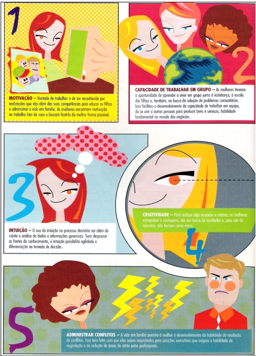 Para motivar os jovens e dar subsídios ao debate, projete as duas lâminas propostas a seguir. Leia cada um dos quadrinhos e problematize as afirmativas. Se houver tempo e for de interesse dos jovens, sugira que construam quadrinhos semelhantes para descrever características masculinas para enfrentar os desafios do novo mundo do trabalho e que apontem para realizações empreendedoras.