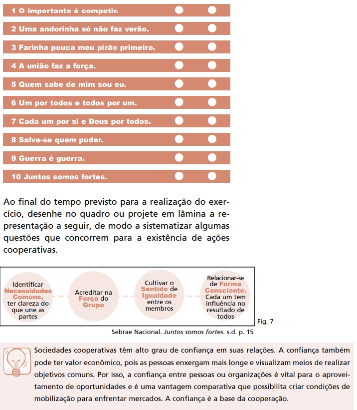 Chamamos de “cooperar para competir” quando pensamos em competir com maiores possibilidades num mercado cada dia mais exigente. Sob este ponto de vista, nossos concorrentes imediatos tornam-se parceiros. Juntos ficamos mais fortes e podemos ir mais longe. Cooperar é essencial para crescer. A cultura da cooperação nos ajuda a criar empreendimentos coletivos: realizações maiores, conquistas praticamente impossíveis de alcançar por outros meios. O ponto de partida para essa grande mudança somos nós, cada um de nós, mudando nossa própria atitude, desenvolvendo uma postura mais cooperativa. Sebrae Nacional. Juntos somos fortes. s.d. p. 22.