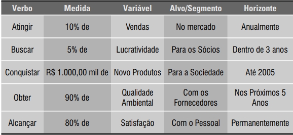 Olhe a sua lista, analise as informações que você anotou. Agora você tem melhores condições para definir os seus objetivos e sintonizá-los o mais próximo da realidade possível. Vamos definir os objetivos para o nosso negócio? Para construir corretamente um objetivo deve-se observar três pontos chaves, descritos a seguir