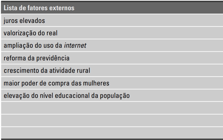 1. Vejamos se o ambiente está mais favorável ou desfavorável. Podese constatar a tendência de alguns fatores do ambiente externo conforme a lista abaixo. Complete-a com mais três fatores que você percebe no ambiente de negócios.