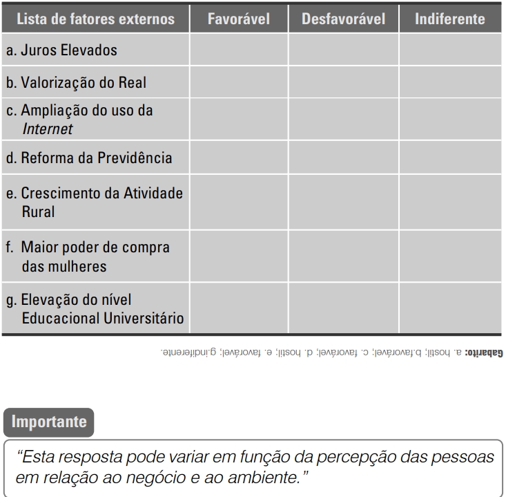 2. Considerando o negócio atual, avalie a lista de fatores externos abaixo e classifique-os como: FAVORÁVEL (podem trazer vantagens para o meu negócio), DESFAVORÁVEL (podem prejudicar o negócio) e INDIFERENTE (caso não tenham qualquer interferência no negócio). Caso não tenha atualmente um negócio, faça o exercício como se você fosse o proprietário de uma pequena venda de frutas em uma cidade com 50.000 habitantes.