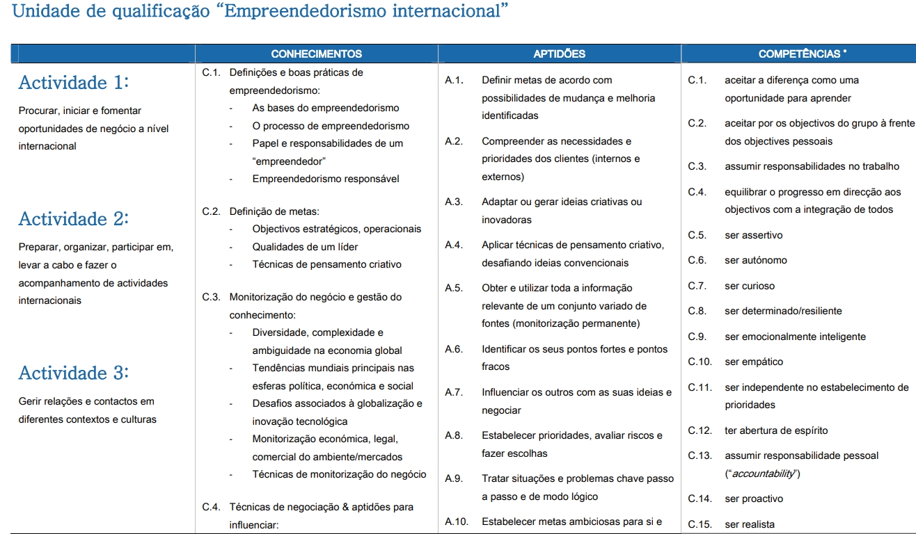 EMPREENDEDORISMO INTERNACIONAL“Unidade de qualificação”, desenvolvida segundo as especificações técnicas ECVET - Sistema Europeu de Créditos para a Educação e Formação Profissional (descrita em termos de conhecimentos, aptidões e competências) sobre EMPREENDEDORISMO INTERNACIONAL.