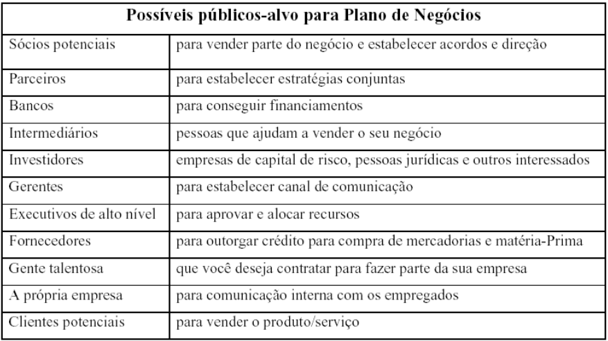 Sabendo-se que direção seguir, o empreendedor deve planejar o seu negócio. Improvisar jamais. Planejar significa decidir antecipadamente o que fazer, mas não só isso, por que fazer, onde fazer, quando fazer, quanto fazer, com quem fazer, como fazer, e não sem antes decidir o para que fazer. O resultado do planejamento é o plano, no caso em estudo, o resultado de um planejamento para iniciar um empreendimento é um plano de negócios. Em resumo, pode-se dizer que planejar consiste em simular o futuro desejado e estabelecer previamente os cursos de ação necessários e os meios adequados para atingi-los. A partir desde momento deve-se iniciar o desenvolvimento do plano de negócios, porém antes de sua construção é preciso determinar o tipo de plano de negócios que deverá ser desenvolvido e para qual público será direcionado, conforme tabela abaixo:
