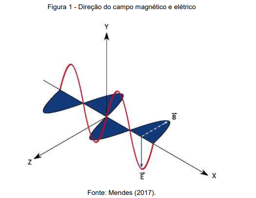 Veja que enquanto o campo magnético (B) se propaga na direção z, o campo elétrico (E) se propaga na direção y. Já a onda segue na direção x todas perpendiculares entre si.