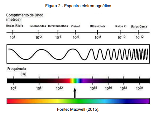 No espectro eletromagnético se pode encontrar o intervalo completo de todas os possíveis comprimentos de onda de radiação eletromagnética. Nele estão representadas as ondas de rádio de grandes comprimentos de onda, e consequentemente baixas frequências, até os raios gama, que possuem altíssima energia e frequência. Conforme a Figura 2 do espectro eletromagnético: