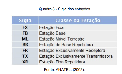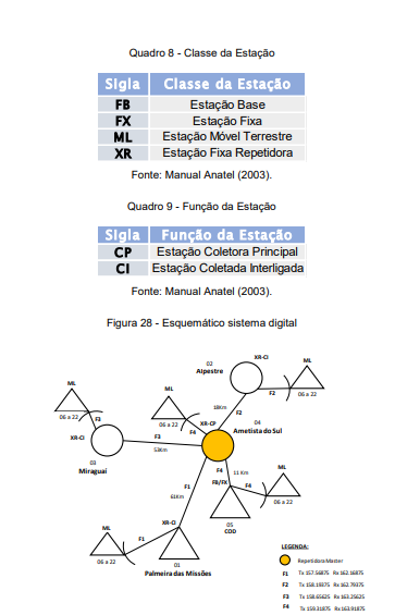 No esquemático da rede implantada, conforme o manual de projetos técnicos da Anatel é detalhado todo o sistema, conforme Figura 28, o mesmo possui siglas referentes à classe e função das estações, conforme Quadro 8 e Quadro 9, respectivamente, seguindo o mesmo manual.